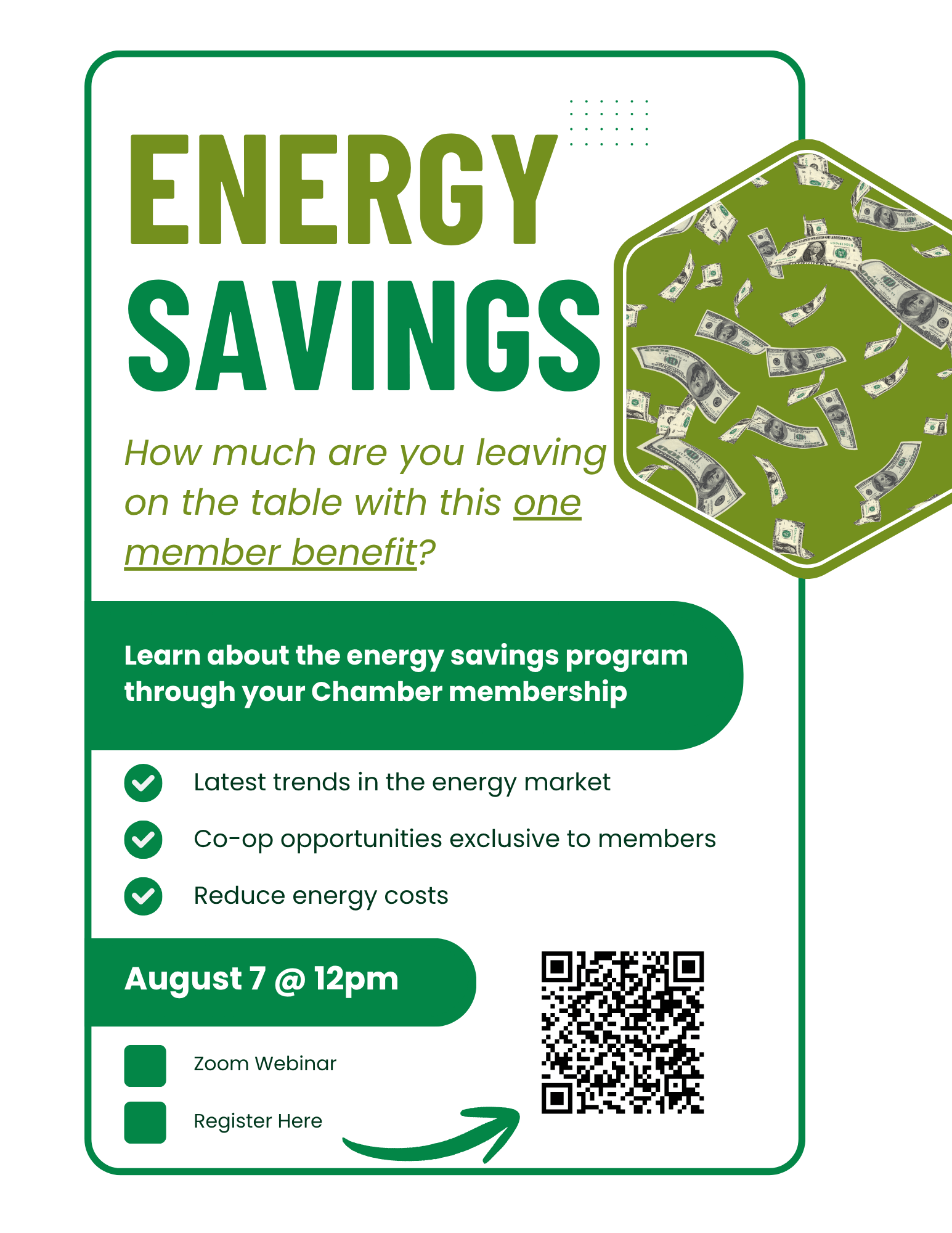 The Chamber will be holding a webinar on Thursday, August 7th at noon where CQI Associates, LLC will be presenting latest updates and trends on the energy market. They will also be sharing updates about the energy co-op program we partner with them on that is a chamber member benefit and helps to reduce energy costs for member organizations. Members need to work with CQI in order to get into the Program. We know the Program delivers energy savings. You don't want to miss this webinar!