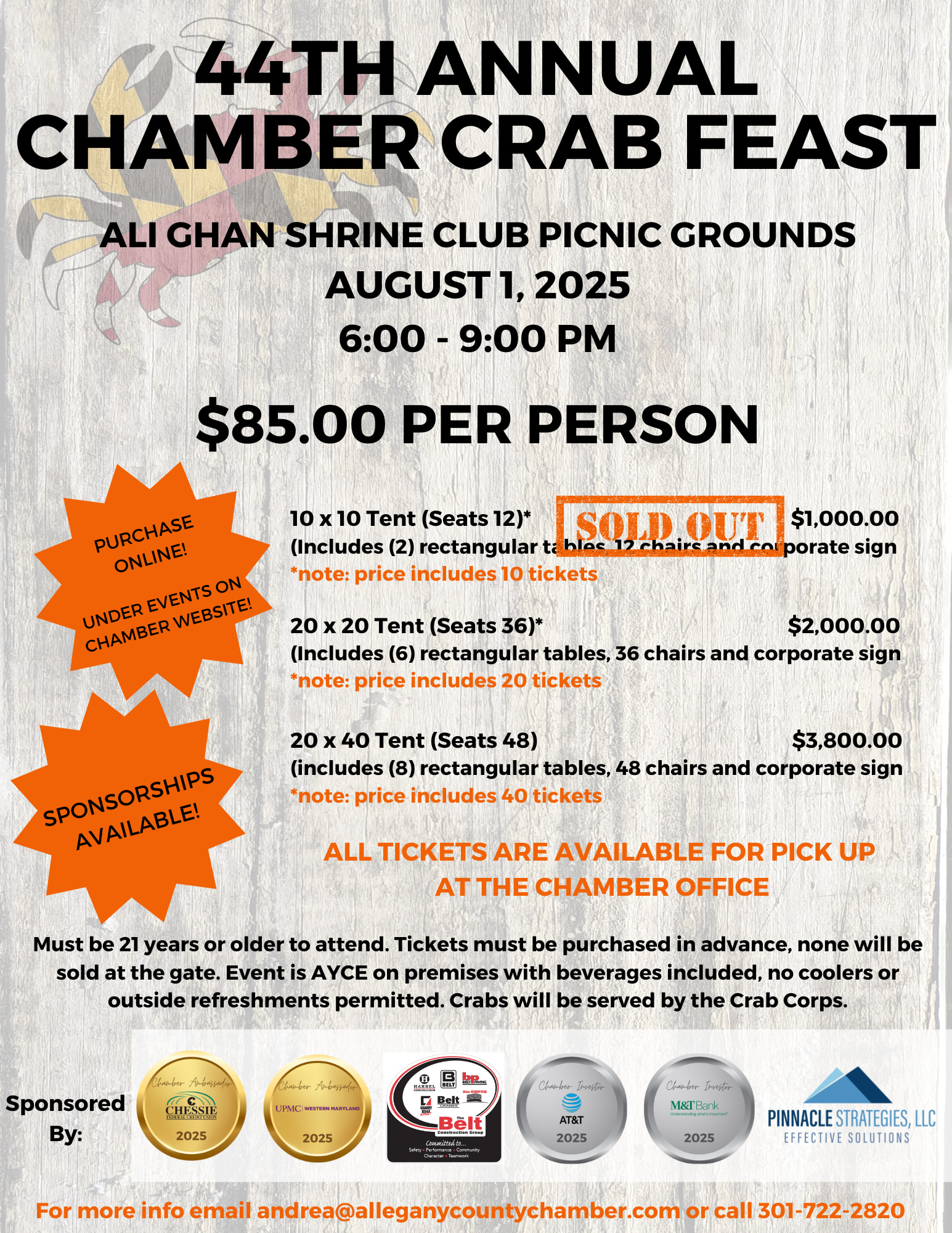 The Chamber Crab Feast is held annually in August at the Ali Ghan Shrine Club Picnic Grounds. All members and guests are invited to attend. Not a fan of crabs? There is plenty of food for every taste buds; crabs, corn on the cob, hamburgers, hot dogs, grilled sausages, sweet treats, and Susie Miller's secret recipe for Maryland Crab Soup. Tickets must be purchased in advance and are non-refundable; no tickets will be sold at the door. You must be 21 years and older to attend the Crab Feast. No coolers or outside refreshments permitted.